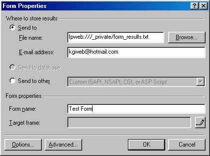 Note: To use the send to file name or E-mail address form submission, you must have your web site hosted on a server that has the FrontPage extensions installed on it, such as HyperMart.net or GeoCities.com.