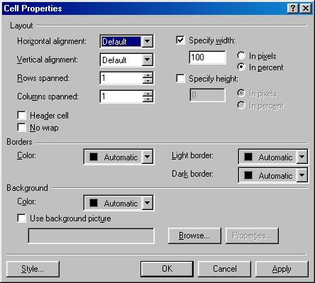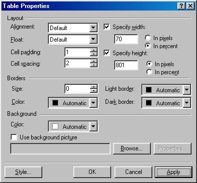 Tables are really useful when laying out a front page or just about any page. It is a great way to create columns of text or just keep text in one column at a specific width. Almost all professional sites on the web today have a "hidden" table behind them. To make a table hidden, with the borders not showing to the web surfer, right mouse click anywhere in the table, and then click on Table Properties on the popup menu. This brings up the Table Properties dialog box window as shown below:
