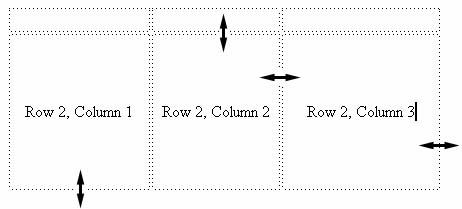 You can easily resize a column or row in a table by using the standard drag and drop mouse technique. The diagram below shows you where to place the mouse pointer to resize columns or rows. When you see the double arrow vertical or horizontal pointers appear, click and hold down the left mouse button, then drag the mouse left or right or up or down in order to size the table. Let go of the mouse button to drop the resized table into place.