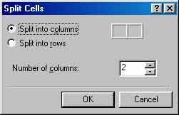 If you want to make a cell into 2 or more cells, simply place your cursor in the cell to split up and then click on the second button in group number 4, as shown in the cut away above. You can also right mouse click in the cell and select "Split Cells..." in the popup menu. This will present you with the following dialog box: