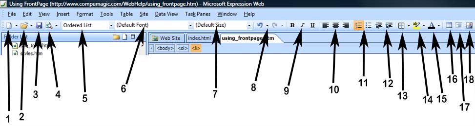 You are not limited in FrontPage to editing only with the graphical user interface. Using the tab at the bottom of the editor window, click on HTML to view the source code of the current page. You may edit the HTML and the text of your document in this mode. Sometimes (rarely) this is necessary to override something that FrontPage generates or that is actually does wrong. This is why it does not hurt to learn the basics of HTML at least.