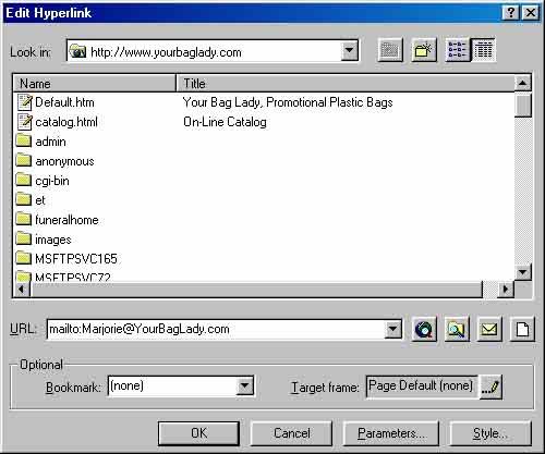 Type in the name of the link, such as MAIL ME, then highlight the text and bring up the Edit Hyperlink window from the toolbar link button. Now in this window click on the little yellow envelope button at the bottom right side of the window, across from the URL edit field. This brings up the Create E-mail Hyperlink window as shown below.