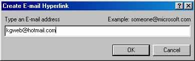 Type in the e-mail address you wish to link to, usually your own, then press the OK button to save it. This will create a hyperlink on your page so that when a user clicks on it, it will bring up their default e-mail client program installed on their computer and the Compose Message window. Of course if the user does not have an e-mail client program installed, or they are working on a public computer, it is wise to list your actual e-mail address on the web page along with the link. For example: MAIL ME at kgweb@hotmail.com. This way the user can see and type in your address into their web based e-mail or just write it down.
