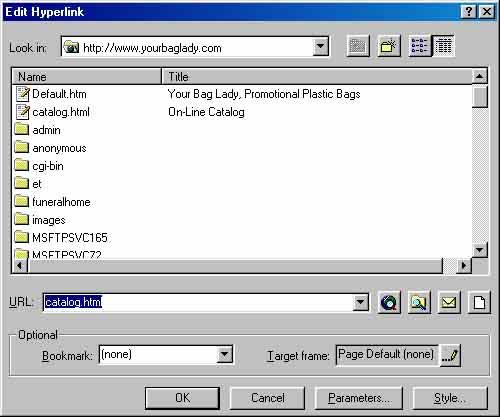 To make an image "linkable" so that a user can click on it to link to a different page do the following: Right mouse click on the image while in the Normal editing mode and then select "Hyperlink" on the popup menu. You can also click on the image with the left mouse button and then press Ctrl-K on the keyboard. This brings up the same Edit Hyperlink window as shown above. Now just follow the same guidelines for creating a text link. Type in the URL and click the OK button when done.
