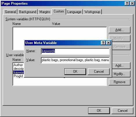 At the bottom of the window you will see the Add... button, on which you should click to bring up the User Meta Variable, as shown above. On this window enter in the Name: as keywords, and for the value enter your list of key words or phrases separated by the comma character. This list can be very long and it will scroll off to the right, so do not worry. For the description, do the same thing. Hit the Add... button, then add the Name: field as description and then for the Value: field type in the same thing you did for the keywords but without the commas.