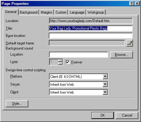 You may recall that earlier in this document we discussed setting the title of a web page using the raw HTML coding method and the <TITLE> </TITLE> tag pair. With FrontPage editor you may do that same thing using the graphical user interface of the program. We set the title of a page in order for users that save your page in their favorites or bookmarks will see this title.